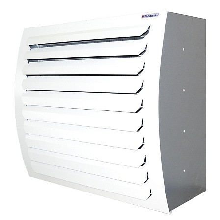 Тепловентиляторы серии TW с водяным источником тепла имеют высокоэффективный воздухонагреватель из медных труб с алюминиевыми пластинчатыми ребрами. Воздухонагреватель позволяет пропускать воду с температурой до 150°С и давлением до 1,2 МПа. Специальная защитно-декоративная решетка на выходном окне тепловентилятора направляет поток нагретого воздуха вниз под углом 45°.